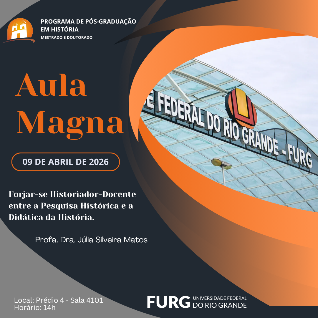 Aula Magna do PPGH-FURG - dia 09/04 - Forjar-se Historiador-Docente entre a Pesquisa Histórica e a Didática da História Inscrições gratuitas no local e com expedição de certificado de participação.